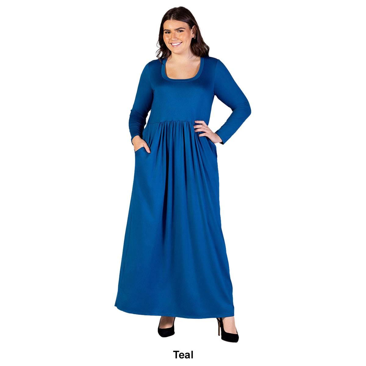 Step into charm with the Plus Size 24/7 Comfort Apparel empire waist pocket maxi dress, a perfect blend of style and comfort. This stunning dress features a classic square neckline and long sleeves, providing a sophisticated look suitable for any occasion. The pleated empire waist design accentuates your silhouette and opens into a flowy a-line skirt that offers grace and ease of movement. The pockets add a touch of convenience without sacrificing style. Crafted from high-quality, comfortable fabric, it ensures all-day comfort while maintaining a polished appearance. Available in various color options, you can effortlessly find the perfect hue to match your style.