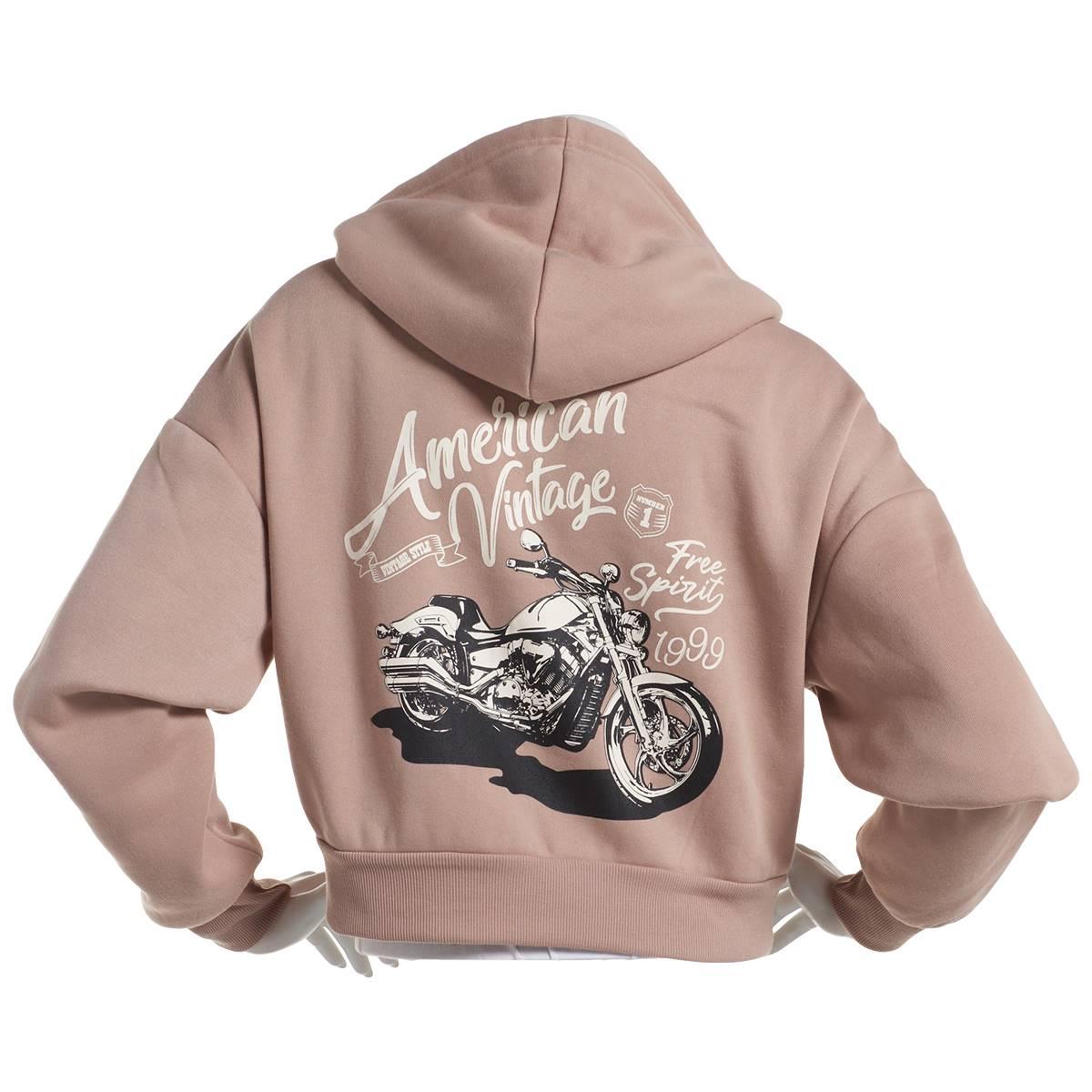 Pattern: Solid Sleeve Length: Long Sleeve Drawstring hood Soft fleece lining Two-way front zip closure Two functional front slip pockets Ribbed hems Varsity graphic on front chest "American Vintage" and "Free Spirit" script on back with motorcycle graphic.
