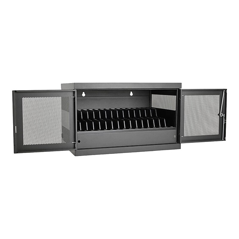 The Tripp Lite CSC16AC 16-device AC charging station cabinet is suitable for chromebooks and laptops of size up to 17". It includes locking, vented steel cabinet, protective shelf with removable dividers and cord management to provide maximum security. This charging station has both wall mount and cart options. Black steel. Dimensions: 18. 8"H x 30. 3"W x 21. 6"D, 10. 6"H x 1. 5"W x 15. 4"D (slot). Compatible with Chromebooks and laptops up to 17" screen size. Charging ports/amps: (16) 12A. Secures devices in locking, vented steel cabinet with cart option, protective shelf with removable dividers and cord management. Sturdy steel construction and powder-coated finish promote long-term durability. Form factor: Floor, wall mountable, desktop, tabletop, countertop. Features removable divider, powder coated, sturdy, secure, durable, padlock, locking mechanism, flow-through ventilation, scratch-and scuff-resistant. Features theft resistant, damage resistant, tamper resistant, cable management, electrical outlet, charge function. Split front doors open 180 deg for improved device and service access. Power source: AC power. Includes charging station cabinet, 2 x keys, owner's manual. Meets Tested to EIA-310-E, FCC & IEC Class B, UL 1363 (Power Component), Tested to NOM (Mexico), RoHS standards. Weight: 97 lbs. Comes with 2 year limited warranty.