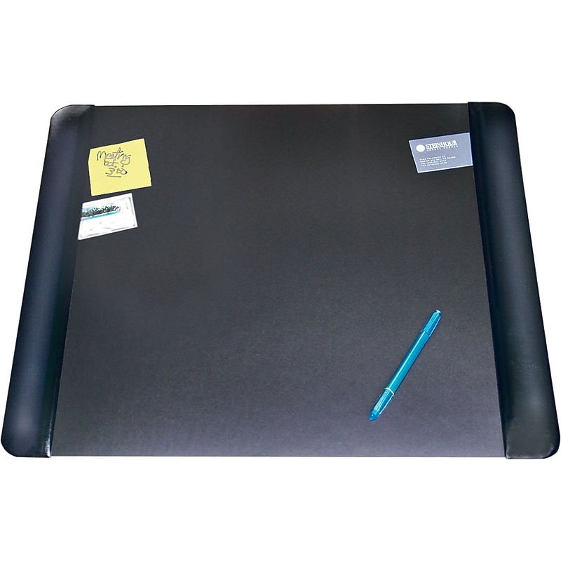 Artistic Executive Desk Pad features attractive, soft leather-like cushioned side panels. Easily slip notes, photos, or business cards under the side panels on both sides. Firm, smooth writing surface infused with Microban(R) antimicrobial product protection. Desk pad helps to protect your desktop from scratches, stains and spills. Non-slip foam backing keeps pad from sliding. Artistic Executive Black Desk Pad with functional cushioned leather-like side panels and firm smooth writing surface. Non-slip foam backing keeps desk pad in place. Desk pad measures 20"H 36"W. Firm, smooth writing surface infused with Microban antimicrobial product protection. Desk pad helps to protect your desktop from scratches, stains and spills. Smooth writing surface. Surface enables smoother writing. Center resists stains, cleans with water. Scratch resistant, stain resistant, spill resistant. Material: Vinyl. Dimensions: 20"W 36"D. ⚠ WARNING: Cancer and Reproductive Harm -www. P65Warnings. ca. gov. ⚠ ADVERTENCIA: Cncer y Daos reproductivos -www. P65Warnings. ca. gov. Artistic Executive Desk Pad with functional cushioned side panels; easily slip notes or business cards under the panel on both sides.