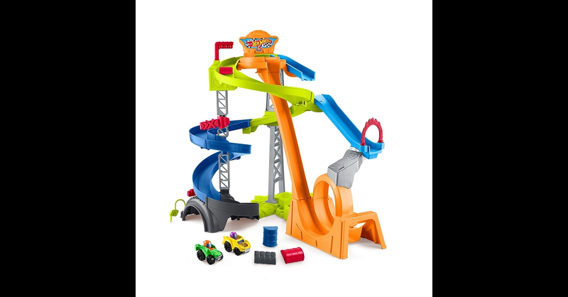 The action-packed Hot Wheels Spiral Stunt Speedway toddler playset by Little People puts thrilling stunt car excitement into small hands for epic racing play. Featuring 2 Hot Wheels-inspired Wheelies vehicles, 3 crash barrels, a 4-car spiral launcher, a classic Hot Wheels loop, a ring of "fire" jump and an off-roading course, this vehicle playset is packed with lots of hands-on storytelling play for your little Hot Wheels racing fan. (Additional Wheelies vehicles sold separately and subject to availability. Color and decorations may vary. ). ?Toddler-friendly stunt car race track playset with Hot Wheels inspired Wheelies vehicles for exciting pretend play. ?4 different tracks! Spiral launcher, Hot Wheels 360-degree loop, ring of "fire" jump & off-roading course. ?Rapid launching! Load & launch up to up to 4 Wheelies cars on the spiral track (Additional Wheelies vehicles sold separately and subject to availability. ). ?Includes 1 playset, 2 Hot Wheels inspired Wheelies cars & 3 barrel accessories sized right for small hands. ?Encourages imaginative play and storytelling for toddlers & preschool kids ages 1 to 5 years old. ?Smilestones: Bringing a smile to milestones! This toy helps Build Confidence as toddlers chase the cars & then successfully place them on the tracks again.