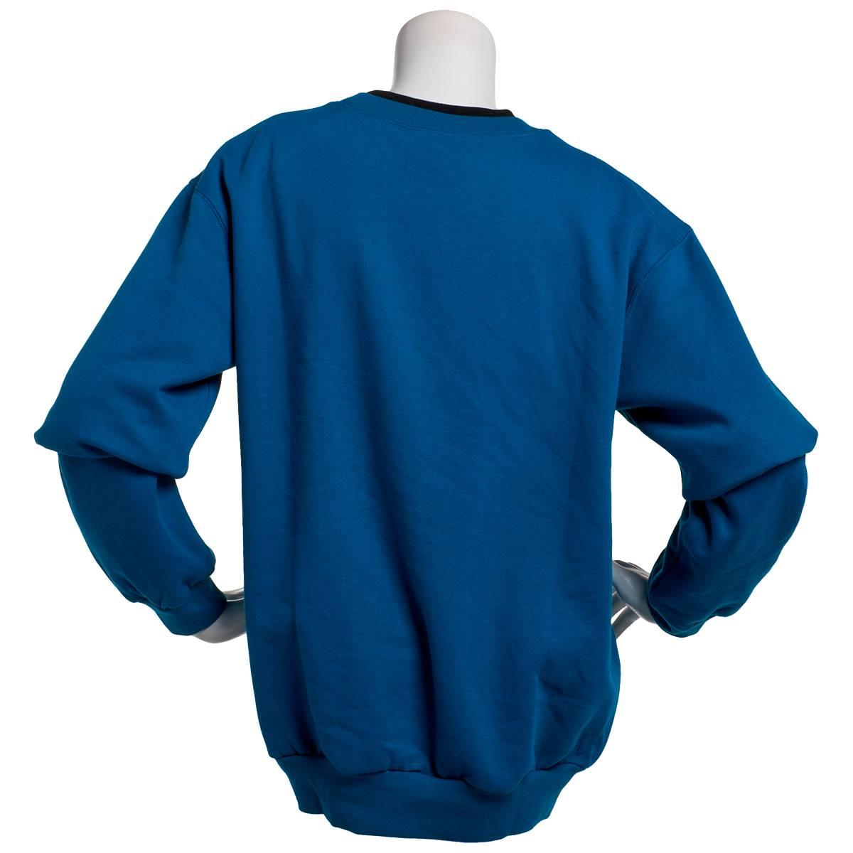 Pattern: Solid Sleeve Length: Long Sleeve Neck: Crew Neck Contrasting neckline inlay Embroidered & bedazzled front Rib-knit neckline, cuff & hem Fleece inner lining Linear hemline.