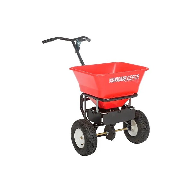 With an adjustable spread range up to 24 ft and a capacity, it's ideal for home owners, property managers and college campuses looking for an efficient way to keep their paths clear. You can cover large areas using bagged salt or ice melt without needing to stop and reload. The manual spreader's 1. 67 cubic foot hopper is made of a durable polymer that won't rust or dent. The enclosed gearbox features commercial grade alloy gears and an integrated grease fitting to protect the spreader's moving parts from the elements. Includes a steel mesh screen to help prevent foreign materials from entering the hopper and nylon cover to protect spreading materials from rain, and other elements. Additional features include powder-coated welded carbon steel frame in for years of low maintenance use. The Walk Behind Groundskeeper Broadcast Spreader makes it easy to de-ice driveways and sidewalks.