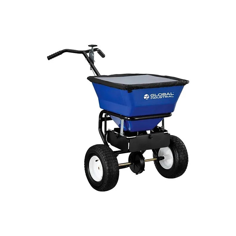 Spreader features a welded steel frame and large 100 lb. capacity plastic hopper with screen that helps prevent materials from jamming. The spreader's enclosed gearbox with commercial grade alloy gears and an integrated grease fitting ensure that the moving parts of the spreader are out of the elements and are easy to maintain. Comfort grip handle with flow regulator for ease of use. Large 13" pneumatic tires make pushing through grass, slush, and ice easy. Adjustable Spread Radius 3' to 30'. The included 3-flap adjustable deflector controls spread pattern, while the rear deflector protects the operator's feet. Includes plastic cover to protect materials from rain, wind, and other elements. Easy assembly. 1-Year Limited Warranty. 100 lb weight capacity. Includes plastic cover to protect materials from elements. Large 13" pneumatic tires. The Global Industrial Universal Spreader is ideal for spreading seed, fertilizer, lime, ice melt, salt, and similar materials.