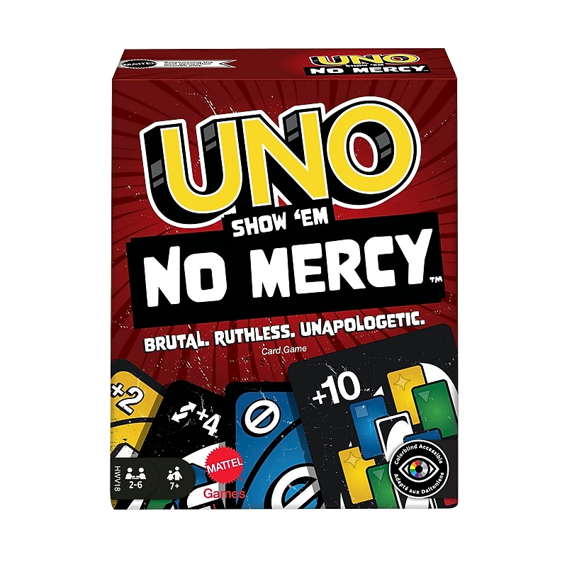 UNO Show 'em No Mercy is our most brutal UNO game yet! It has a ton more cards with WAY tougher penalties (draw 10 cards anyone?) and new rules that will have players stacking, swapping and drawing more cards than ever before! And there's even a Mercy Rule (yes, we get the irony) if things get too rough. There are two ways to win in this merciless version of the classic game: get rid of all cards OR knock all other players out of the game! Oh and if you manage to get down to one card, don't forget to yell "UNO!". UNO Show 'em No Mercy game adds 56 more cards, special rules and super-tough action cards for the most brutal edition of UNO ever!. Tougher action cards, such as Skip Everyone, Wild Draw 6 and even Wild Draw 10 make game play merciless!. The Stacking Rule lets players pass the penalty (Draw +2, +4, +6, +10) to the next player until whoever can't play has to take all the cards combined!. Whenever a ""7"" or a ""0"" card is played, players must swap hands with another player!. The Mercy Rule means that if any player gets 25+ cards in their hand, they are out of the game!. More cards mean more chances to show opponents absolutely no mercy!. Makes a great gift to amp up the action on friends and family game nights, travels and parties!.