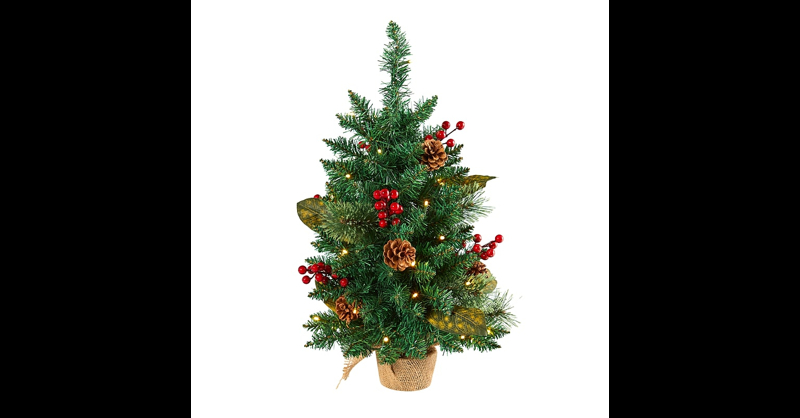 Create the ultimate holiday scene with this artificial Christmas tree; entirely maintenance-free, it boasts a collection of pine foliage, accented throughout with miniature faux pinecones and bright, red berries. Pre-strung with 35 LED lights, this 2' tall Christmas can easily be re-used for years to come. Overall Product Dimensions: 11in. W x 11in. D x 24in. H ; Measurements are from the bottom of the tree to the furthest extended branch. Width dimensions are also calculated from the furthest outstretched dimension. For indoor use only. Pre-strung with 35 LED Lights (battery operated) to eliminate tangles and knots. Contains 80 tips for decorative ornaments. Stabilized in a Decorative container. Ideal holiday decoration. Artificial trees are manufactured using synthetic materials and are well designed and constructed to be life-like in appearance. Item will need to be re-shaped when removed from the box; this tree can easily bend for reshaping purposes - please separate and fluff the branches to achieve desired fullness. Planter Dimensions: H: 4 In. W: 13 In. D: 13 In.