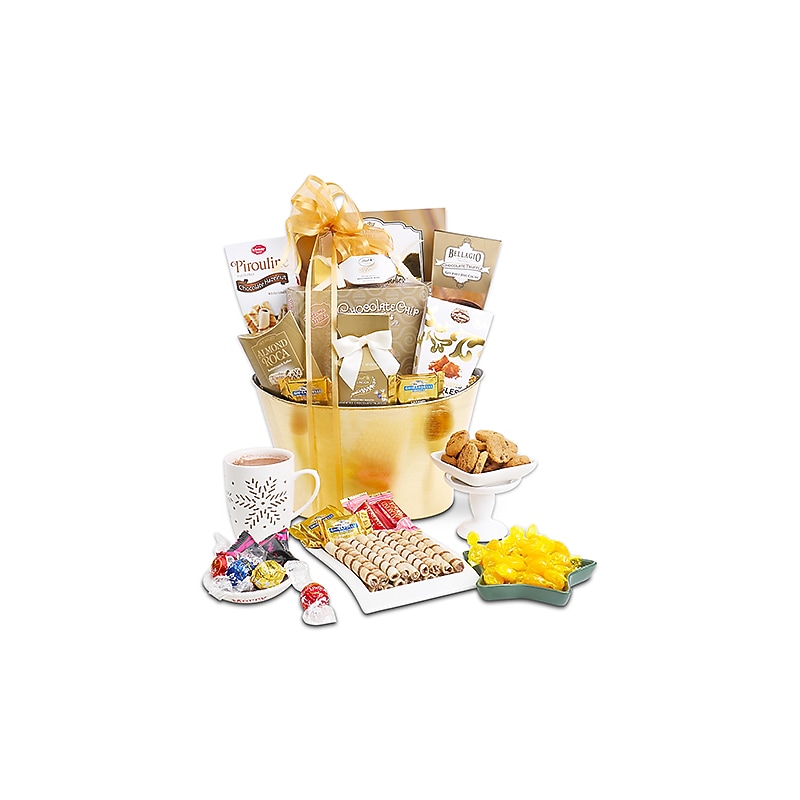 For all our chocolatiers, you will be sure to love this Chocolate Extravaganza Gift Basket. Enjoy an assortment of gourmet pieces from some of the world's most famous chocolatiers all wrapped up in one gift by Alder Creek Gift Baskets. From Lindt, Ghirardelli and even Almond Roca, our hand selected assortment of rich and decadent chocolates will satisfy any sweet tooth. Includes: Ghirardelli Milk Chocolate Caramel Filled Tasting Squares (2pcs. ), Almond Roca (0. 8oz. ), Lindt Lindor White Chocolate Truffle (1pc. ), Lindt Lindor Assorted Chocolate Truffle (0. 8oz. ), Bellagio Chocolate Truffle Cocoa (1oz. ), Truffettes de France Cocoa Dusted Truffles (1. 2oz. ), Pirouline Chocolate Hazelnut Wafer Rolls (3. 25oz. ), Butterscotch Hard Candies (3oz. ), Homemade Chocolate Chip Cookies (3oz. ). Thoughtfully assembled by hand and tied with classic bow inside a reusable gold resin container. Great gift for friends, family, or coworkers. Manufactured in a facility that also processes products containing milk, wheat, tree nuts, peanuts, soy, sesame, and coconut. Assembled by a woman-owned business.