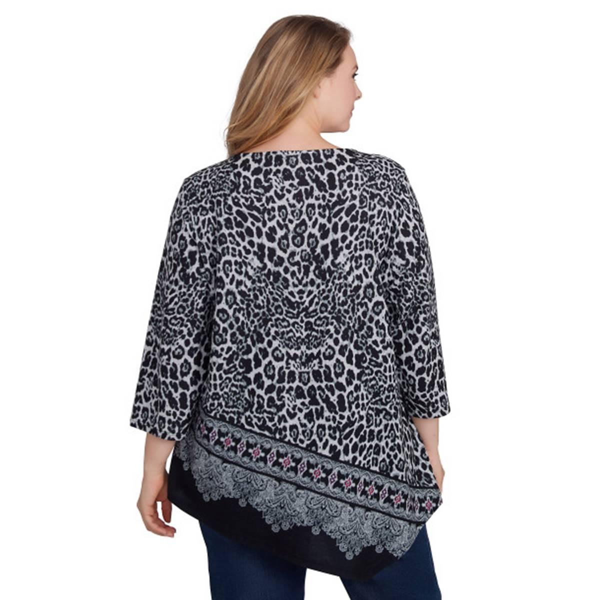 This Plus Size Ruby Rd. Cozy Season versatile, ready-for-any-occasion knit asymmetric hem blouse is detailed with a leopard paisley border print, lovely ballet neck 3/4 length sleeves. Low Iron.