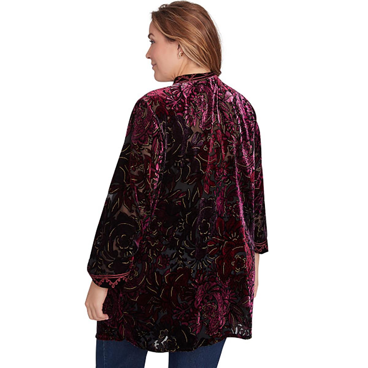 Collection: Berry Glam Pattern: Floral Sleeve Length: 3/4 Sleeve Embroidered trim detail Velvet fabrication Asymmetrical hem Open front Do not iron.