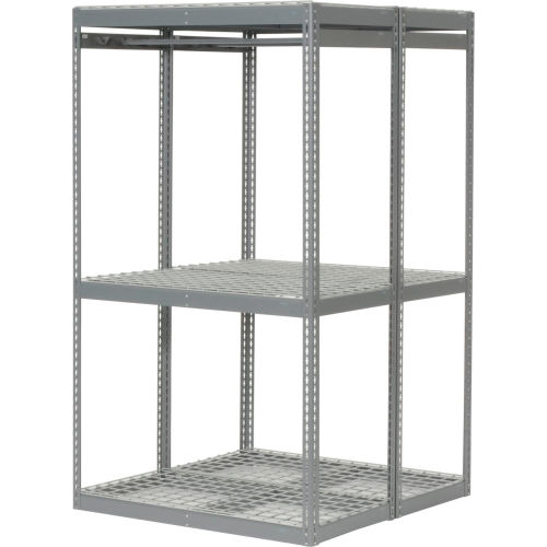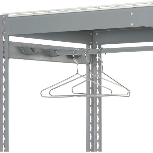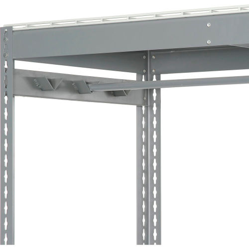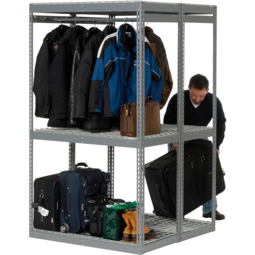 Boltless Luggage Garment Combo Rack - 48"W x 48"D x 84"H - 796548 Expect top performance with rugged steel shelving that features super-strong roll-formed steel framing with positive interlocking beam-and-post connections for quick assembly. All shelf levels also include double-rivet support for added rigidity. This unit includes shelf supports and wire decking. Levels adjust at 1-1/2" increments and permit 4-way access. 14-gauge steel uprights measure 2-1/4" x 1-1/2". Durable gray baked enamel.