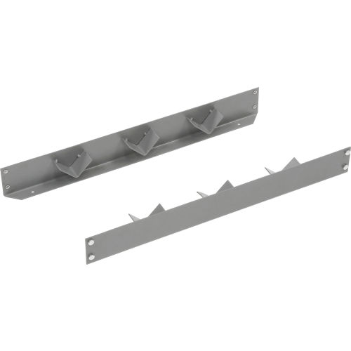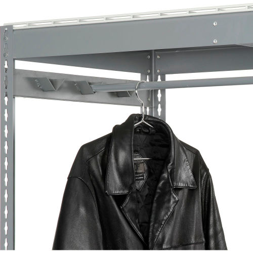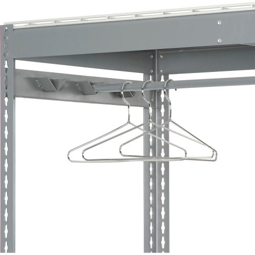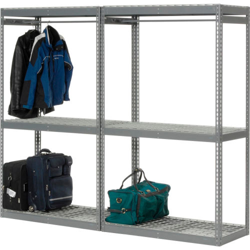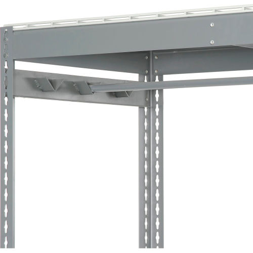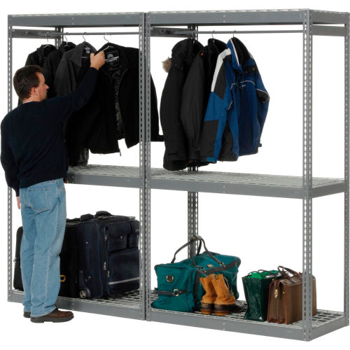 Boltless Luggage Garment Double Rack - 96"W x 24"D x 84"H - 796546 Expect top performance with rugged steel shelving that features super-strong roll-formed steel framing with positive interlocking beam-and-post connections for quick assembly. All shelf levels also include double-rivet support for added rigidity. This unit includes shelf supports and wire decking. Levels adjust at 1-1/2" increments and permit 4-way access. 14-gauge steel uprights measure 2-1/4" x 1-1/2". Durable gray baked enamel.