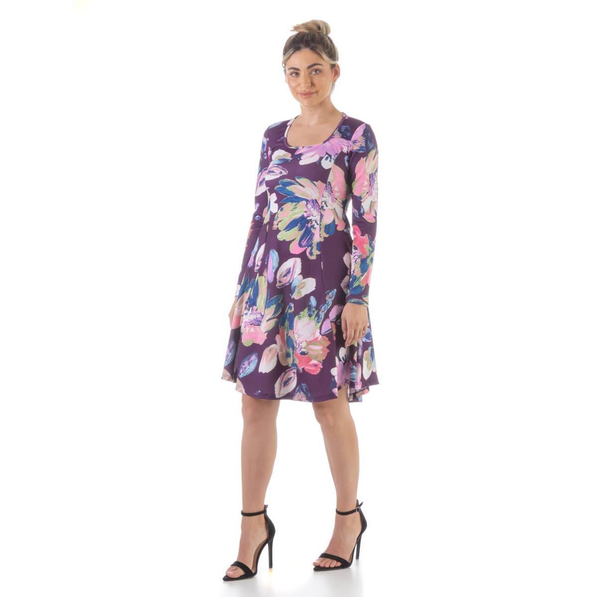 This Womens 24/7 Comfort Apparel floral long sleeve knee length dresscan easily be worn as a casual or dressy look. Featuring a square neckline, long sleeves, and a flattering flared shape. Style with boots or flats for a day look or dress it up with heels.