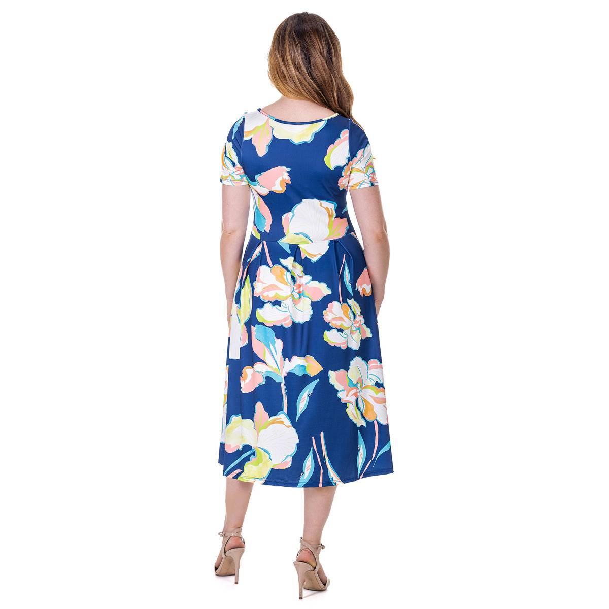 Meet the Womens 24/7 Comfort Apparel blue floral fit & flare midi dress. The perfect blend of glam and comfort that effortlessly transitions from casual chic to parties. This dress is a wardrobe game changer with its short sleeves, round neckline, and the functional flair of pockets that add a touch of practicality to your ensemble. The flattering fit and flare silhouette, coupled with subtle pleats, strike the ideal balance between modesty and playfulness, making it a versatile choice for any woman.