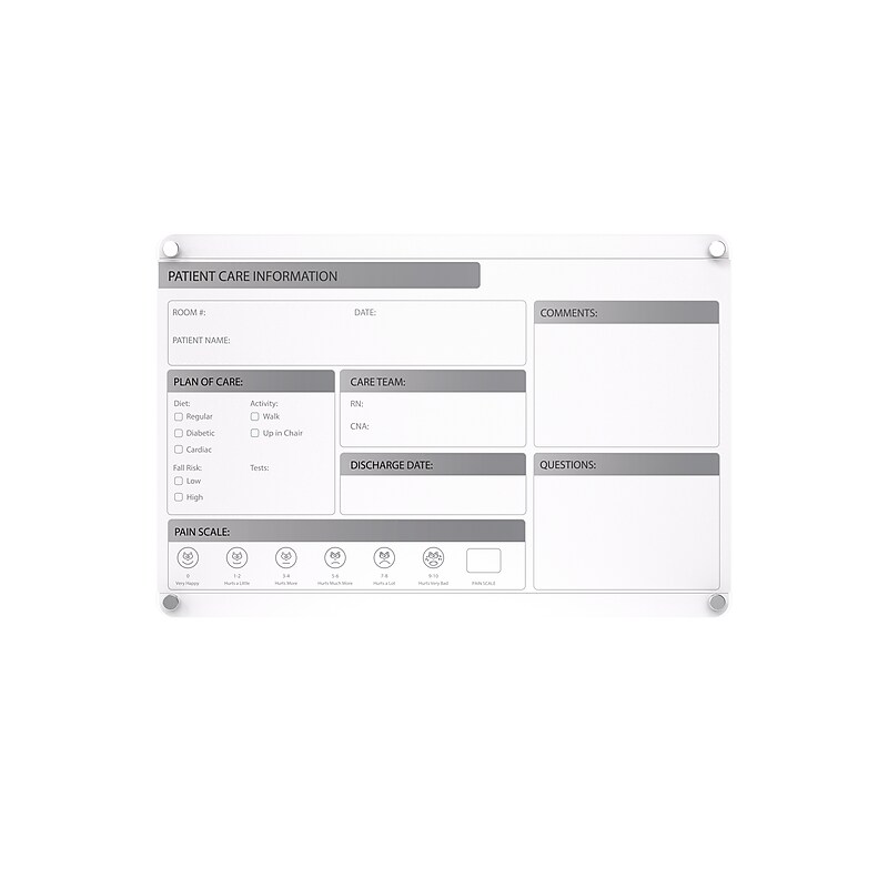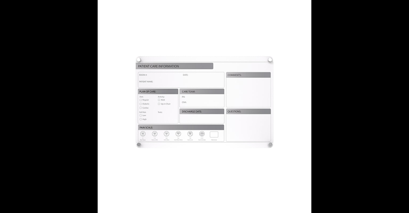 Ghent's Slide Changeable Patient Room Glassboards are the perfect communication tool for patient care in any healthcare environment. The interchangeable patient communication board comes with a sleek and easy to disinfect glass surface and a changeable, double-sided patient information graphic insert, that can slide to the left or right, to switch between English and Spanish for versatility for effective engagement between patients and care providers. With the look of permanent graphics, the interchangeable insert makes the board flexible, perfect for the ever-changing healthcare environment. Hospital communication boards are a great option for patient rooms to engage in effective communication between nurses, doctors and patients. Patient room boards can help improve HCAHPS and patient satisfaction scores for your hospital. They allow you to showcase different care plans or multiple languages with a removable insert that is easily replaced if branding or initiatives change. Ghent changeable patient room glassboard featured 1/4" tempered safety glass with radius corners and tamper-resistant standoffs. Glassboards are ideal for healthcare as they withstand high-use and do not ghost or stain, ensuring sensitive patient information is not left behind. Patient room boards are shipped to you in Ghent's worry-free packaging, designed specifically for shipping glassboards. Constructed of tempered safety glass with radius corners featuring tamper-resistant stand-offs. Double-sided insert slides out from behind glass to reveal Spanish or English language prompts. 1/4" tempered glass writing surface resists ghosting and staining. Glass surface can be cleaned with most hospital grade cleaners for disinfecting between patients. Limited Lifetime Warranty.