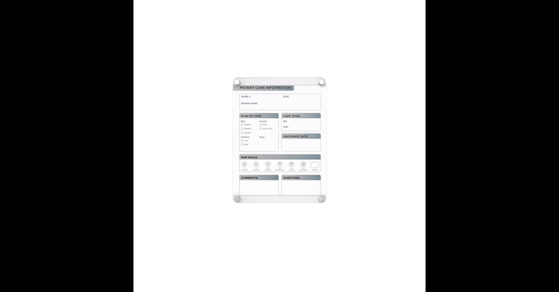 Ghent's Slide Changeable Patient Room Glassboards are the perfect communication tool for patient care in any healthcare environment. The interchangeable patient communication board comes with a sleek and easy to disinfect glass surface and a changeable, double-sided patient information graphic insert, that can slide to the left or right, to switch between English and Spanish for versatility for effective engagement between patients and care providers. With the look of permanent graphics, the interchangeable insert makes the board flexible, perfect for the ever-changing healthcare environment. Hospital communication boards are a great option for patient rooms to engage in effective communication between nurses, doctors and patients. Patient room boards can help improve HCAHPS and patient satisfaction scores for your hospital. They allow you to showcase different care plans or multiple languages with a removable insert that is easily replaced if branding or initiatives change. Ghent changeable patient room glassboard featured 1/4" tempered safety glass with radius corners and tamper-resistant standoffs. Glassboards are ideal for healthcare as they withstand high-use and do not ghost or stain, ensuring sensitive patient information is not left behind. Patient room boards are shipped to you in Ghent's worry-free packaging, designed specifically for shipping glassboards. Constructed of tempered safety glass with radius corners featuring tamper-resistant stand-offs. Double-sided insert slides out from behind glass to reveal Spanish or English language prompts. 1/4" tempered glass writing surface resists ghosting and staining. Glass surface can be cleaned with most hospital grade cleaners for disinfecting between patients. Limited Lifetime Warranty.