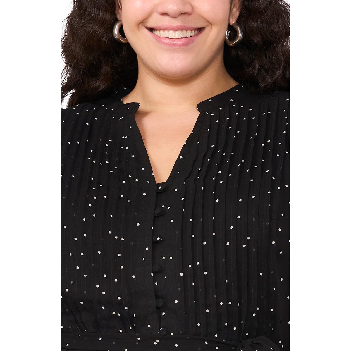 Pattern: Dot Sleeve Length: Long Sleeve Neck: Split Neck Dress Length: 37" Pintuck accented yoke Blouson sleeve with elastic cuffs Removable coordinating sash belt Cascading pleat detail Fully-lined Pullover.