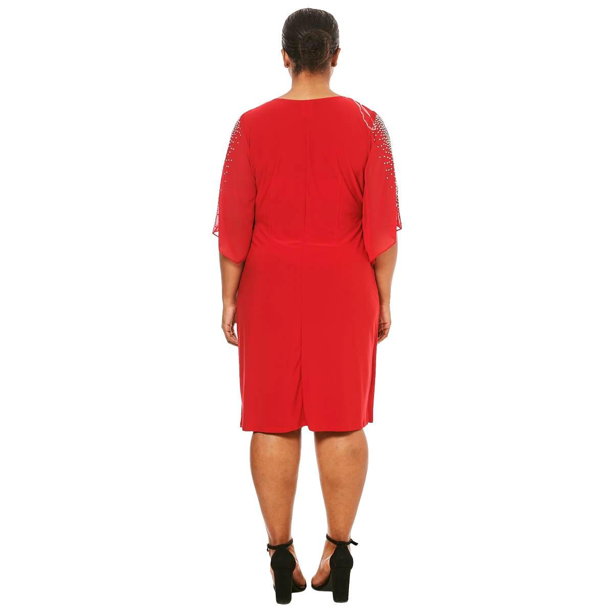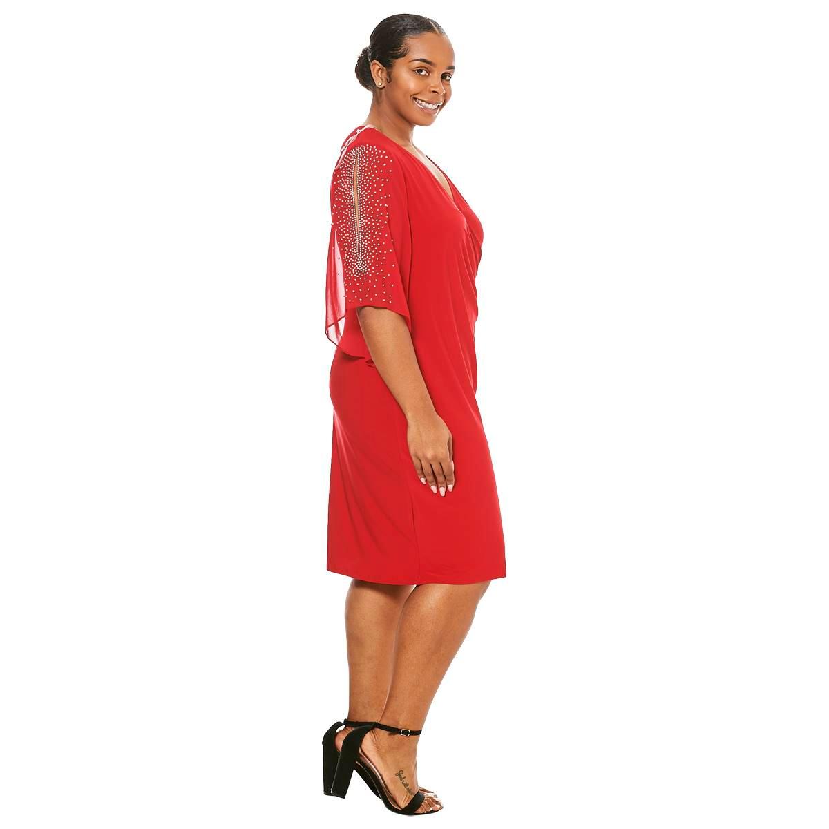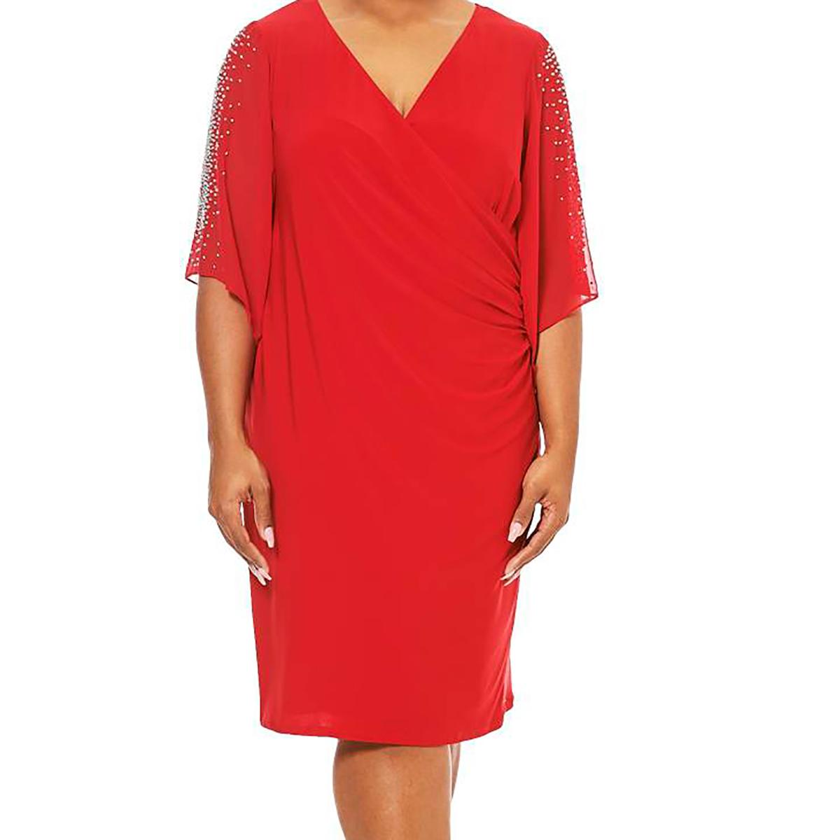 The Plus Size MSK sheath dress for any special occasion. This solid dress features a surplice neckline, 3/4 jeweled angel sleeves, and side ruching. Length: 38".
