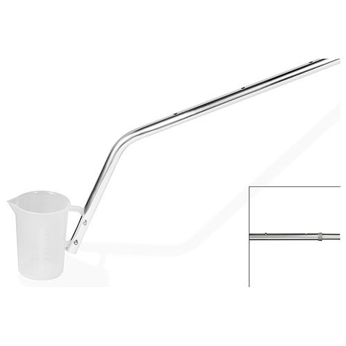 For taking samples of water, sewage, wastes and effluents from lakes, streams, tanks, or ponds, the water sample dipper provides a long reach for otherwise inaccessible spots. graduated polypropylene plastic pitcher mounted on an aluminum tube handle Handle has 3 parts, a 91cm (3') lower section, a 112cm (44") telescoping section, and an additional 91cm (3') upper section Connections are made with spring buttons with adjusting steps, 15cm (6") apart Minimum handle length is 91cm (3'), maximum length is 274cm (9') Handle diameter is 2.5cm (1") with 2.2cm (7/8") telescoping tube.