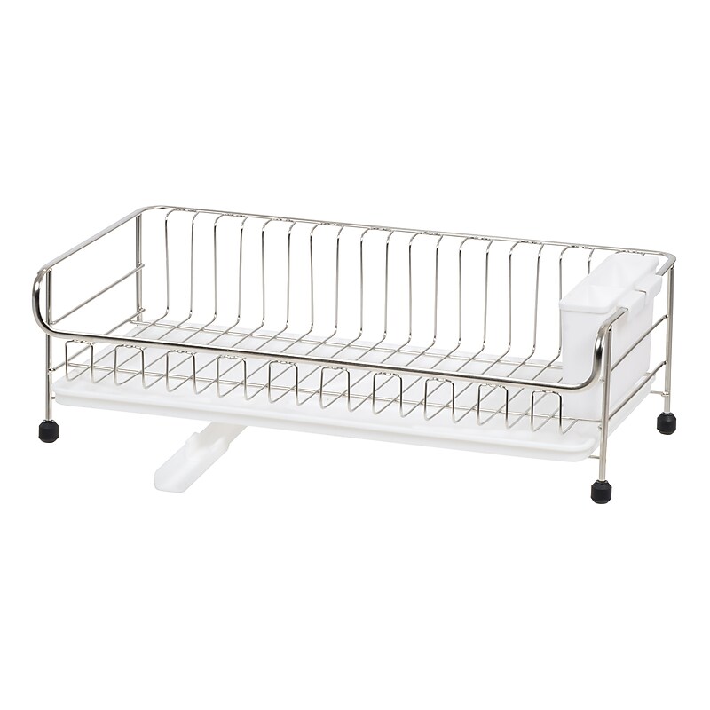This IRIS USA dish rack sits on a plastic drip tray that catches water as it falls off the dishes. The draining spout on the bottom of the tray lets you drain water right into your sink. Spout rotates 360 so it can reach the sink no matter which side you place the rack on, letting you place it in the spot that best suits your countertop. The rust-resistant stainless steel frame means this dish rack is built to last and is easy to clean. Compact design is great for fitting a lot of dishes in a small space. Rubber feet on legs keep rack from sliding when loaded with dishes. Drain spout can be removed making cleaning quick and easy. Bottom tray and 360-degree-adjustable drain spout catch water and drain it back into your sink. Sturdy stainless steel construction holds your plates, dishes, cups, pans and more. Stainless steel frame is rust resistant and easy to clean. Drain spout also removeable for easy cleaning. Rubber feet prevent dish rack from sliding around keeping your dishes and you safe. Dimensions: 16. 90"L x 9. 05"W x 5. 10"H.