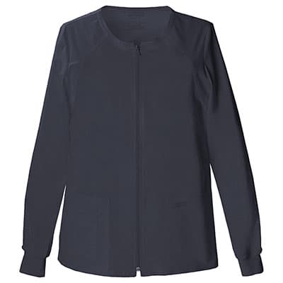 A Plus Size Cherokee jewel neck zip front warm-up jacket features two patch pockets, a right side pocket with a sectional pocket and ID loop, back yoke, back princess seams for slimming fit, and matching knit cuffs. Center back length 27".