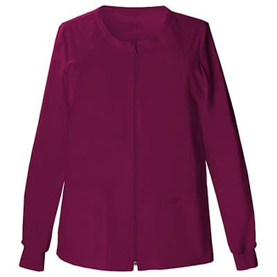 A Plus Size Cherokee Work Wear Cherokee jewel neck zip front warm-up jacket features two patch pockets, a right side pocket with a sectional pocket and ID loop, back yoke, back princess seams for slimming fit, and matching knit cuffs. Center back length 27".