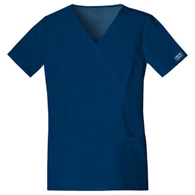 Plus Size Cherokee mock wrap top features front princess seams and double needle top stitch detail. Also included are front patch pockets, a right side pocket with a sectional pocket and ID loop, a left side pocket with an instrument loop holder across pocket. Back princess seams and side vents complete the picture. Center back length 27". 55% Cotton, 42% Polyester, 3% Spandex Twill.