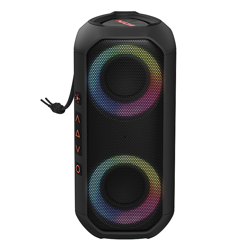 The ION Uber Boom Portable Bluetooth Speaker with LED Lights is designed to enhance your personal listening experience with its impressive features. The speaker lights move to the beat of your music, adding an extra element of fun, while the speakers long-lasting battery life of up to 10 hours provides ample power. It is also IP66 water-resistant and sandproof, so accidental spills, splashes, or sand wont cause damage. The wireless speaker also features Stereo Link, which enables you to connect an additional Uber Boom for an even more immersive audio experience. The speaker also has SD Card playback so you can conveniently play material recorded on other devices. And the aux input allows easy connectivity to non-Bluetooth devices. The ION Sound Control app allows you to customize the audio and lighting. The speaker boasts a high-power 40-watt sound system with dual 2. 25-in. full-range speakers and 2 passive radiators to deliver lifelike sound quality and fill a room with sound. Finally, the built-in microphone provides hands-free call answering. The Uber Boom portable wireless speaker is an ideal choice for music lovers who want to elevate their audio and visual experience. Indoors or outside, this portable Bluetooth boombox-style speaker will put the boom into your music in any environment. 40-watt max power output. Frequency response: 9- Hz to 16 kHz (at -10 dB). Dual 2. 25-in. full-range speakers with 2 passive radiators to deliver lifelike sound. Bluetooth v5. 0 connectivity for audio streaming up to 100 ft. ; Stereo-Link pairs a like speaker (sold separately) up to 50 ft. away for stereo playback; built-in microphone for hands-free call answering. Multicolored LED lights around woofers glow and dance to the beat. Compatible with ION Sound Control app so you can customize audio and lighting. Bass boost button for maximum sound impact. Water-resistant and sandproof (IP66) for fun on the beach, trail, and in the rain. microSD Card input (supports up to 32 GB) for playback of digital audio files and aux input to easily connect non-Bluetooth devices. Rechargeable battery with up to 10 hours of playback time; charge time up to 4. 5 hours. Dimensions: 8. 98 in. W x 3. 82 in. D x 4. 06 in. H. Includes strap, 1. 6-ft. USB-A to USB-C charging cable, and quick-start guide. Safety Data Sheet.