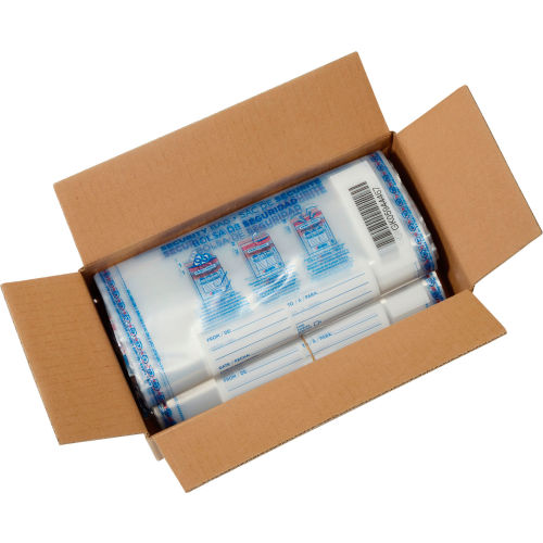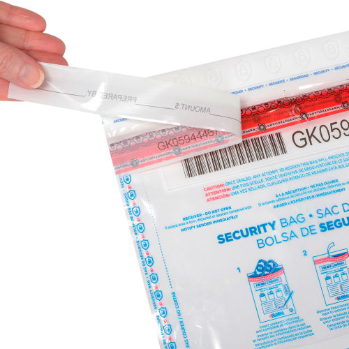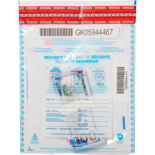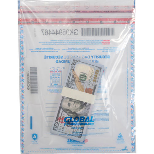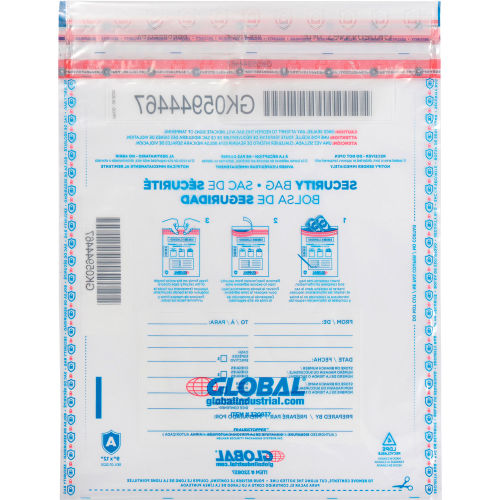 The Global Industrial Fraudstopper Tamper Evident Deposit Bag offers a disposable, economical and safe option to transport, track and deposit money. The water and tear resistant x clear bags provide secure content protection and reliable storing conditions.The bag contains trilingual text in English, French and Spanish. FraudStopper Level 4 Security Advanced technology to ensure that once the security bags are sealed, any attempt to reopen them will show clear signs of tampering. Manufactured with high-strength, 3-layer, co-extruded film. Exceeds all bank and CIT requirements for tamper-evidence at temperature extremes. 100% recyclable (Category 4 LDPE). Package quantity is 100 bags. Overall Dimensions: 9-1/2"W x 12-1/4"H Inside Dimensions: 9"W x 12"H.