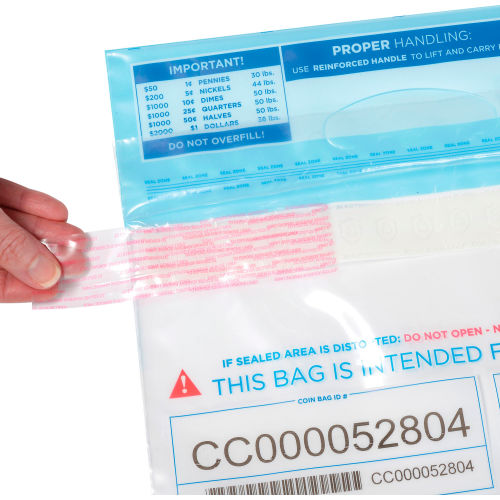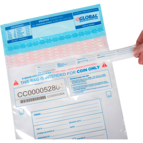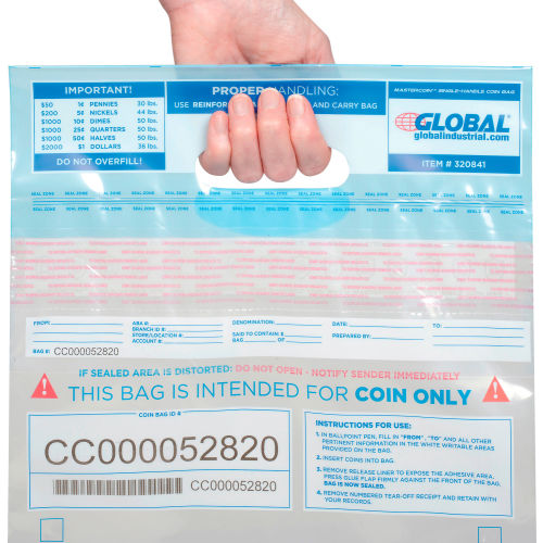 Trusted by the world's leading armored carriers and financial institutions the Global Industrial MasterCoin bag ensures reliable and secure storing conditions in a clear, easy-to-seal x bag. Designed to minimize fraud and loss during transfers and other exchanges, this versatile and durable coin bag meets the most stringent testing requirements of the coin processing industry and the Federal Reserve. The 3" reinforced handle is easy to grab and grip, simplifying the transportation process when transferring multiple bags to different locations. Manufactured from a proprietary 3-layer, puncture-resistant film blend. Package quantity is 100 bags. Overall Dimensions: 12"W x 22"H Inside Dimensions: 12"W x 19"H.
