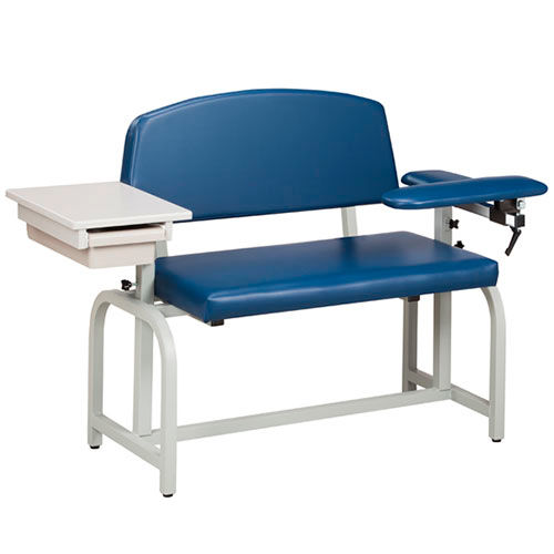 Clinton's Lab X Series, Extra-Wide, Blood Drawing Chairs feature thick padded surfaces supported by a durable steel frame. The additional width can accommodate a larger patient, or a parent and a child. Features: Padded seat and backrestPadded flip arm and armrestClintonClean drawer topOne-piece, all-plastic drawerA full 35" wide seat to accommodate a larger patient or parent and child (89 cm)1-1/4" square, heavy duty, all-welded, tubular steel frame (3.18 cm)Adjustable height and depth flip arm(s)Flip arm(s) positions in place when in use, then flips out of the way for easy exit Comfortable 2" padding throughout (5 cm)Neutral Gray, powder-coated frameHeight adjustable armrestEasy-clean, durable vinyl in a selection of colors (See Color Chart in Photo/Video Gallery**)Chair-mounted options available400 lbs. combined load capacity under normal use (181.4 kg)IMPORTANT NOTE: Clinton Blood Drawing Chairs are not engineered to restrain a fainting or falling occupant. The chair's occupant should NEVER be left unattended. ORDERING NOTE: Customer MUST add arm suffix number to model number when ordering any model with alternate arm options, otherwise chair will be shipped as shown. **Customer MUST select upholstery color for the chair. Please use Standard Upholstery Color Chart to choose color and call Global's Customer Service prior to placing an order (888) 978-7759.