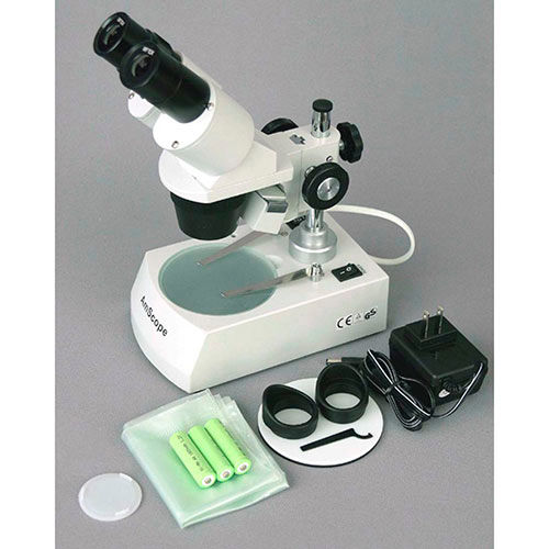 This is a cordless LED binocular stereo microscope with top and bottom lights. It is designed for both indoor and outdoor applications, powered by either batteries or wall-power. It is portable and can be taken out to field sites. This microscope offers sharp clear stereo images, two magnification levels (20X & 40X), and the freedom from cords. It comes with a rechargeable illumination system that takes three rechargeable AA batteries (not included), and an AC adapter/charger. This durable and reliable microscope is a perfect instrument for viewing insects, plants, rocks, stamps, coins, jewel and etc. It is an ideal microscope for hobbyists and students. Features: A great cordless stereo microscope with top and bottom LED lightsPowered by either batteries or wall-powerConvenient for being taken out for on-site applicationsBuilt-in rechargeable incident and transmitted LED illumination system (AA batteries not included)10-LED top light and 7-LED bottom lightTwo magnification settings: & 40X45 degree inclined binocular head with locked-in eyepiecesAdjustable interpupillary distanceSharp stereo erect images with wide field of viewHigh quality original true colorOcular-tube with adjustable diopterAccurate alignment, ensuring fatigue-free viewing for hoursRugged metal frame and standFull optical glass elementsPrecise ground glass lensesAll metal mechanical componentsGS CE approval electric apparatusWhite/black plate and rubber eyeguards includedManufactured under ISO 9001 quality control systemExcellent five (5) year warrantySpecifications: Head: 45 degree inclined binocularEyepiece: WF10XObjectives: 2X, 4XDiopter Adjustment: +/-5dpInterpupillary Distance: 2-3/16" - 2-15/16"(55-75mm)Working Distance: 2-1/8" (53mm)Frosted Glass Objective Plate: 3-3/4" (95mm) in diameterWhite/Black Plastic Objective Plate: 3-3/4" (95mm) in diameterIllumination: 10-LED top light and 7-LED bottom lightAccessories: a pair of eye-caps, a pair of clips and a dust coverPacking List: One Forward Binocular Microscope with 2X & 4X Objectives, Pillar Stand and Top & Bottom LED LightsOne Pair of Widefield 10X EyepiecesOne Wall-Power AC Adapter/ChargerOne Frosted Glass PlateOne Plastic PlateOne Dust CoverOne Pair of Eye-guardsOne Pair of ClipsOne Wrench for Tension AdjustmentUser's Manual.