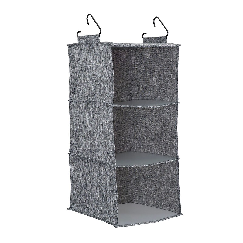 Its 3 shelves give added storage to almost any closet without taking up too much space, while the classic and simple style adds a sophisticated touch to your closet layout. This organizer can be used in any closet in your home to add additional space and organization. To set up the shelves, use the 2 sturdy hooks attached the top to hang the organizer on either a rod or wire closet shelf. The shelves softfabric lining is breathable, allowing fresh air to circulate through items, such as shoes. This will prevent stale air from affecting your clothing and other accessories. The PEVA shelf bottoms give the shelves a more rigid structure to prevent sagging as well. This will preserve the organizer's attractive design through repeated daily use. Use this hanging organizer to sort your bedroom, hallway, entryway and other closets to your liking. The shelves can be used to store folded clothing such as sweaters, shirts and pajamas. It can also be used to organize extra linens in the hallway or store items like pocket umbrellas and shoes in an entryway closet. This shelf pairs nicely with our Wide Closet Organizer Drawers to contain smaller items such as scarves, socks and undergarments. This item presents a great opportunity to organize various storage spaces to your liking. The 3 shelves give a good amount of storage potential while the neutral yet sophisticated design makes it an excellent match for any style of decor. This hanging closet organizer offers 3 shelves to maximize space and help you achieve your dream closet layout. Gray fabric shelves are soft and permeable to encourage airflow, while PEVA shelving provides a stable shelf surface and prevents sagging. Use this hanging shelf to store clothing such as sweaters, shirts and pants and organize other items such as shoes, towels and bedsheets. The 2 hook system gives the shelves needed support and allows for easy installation. 24 H x 12 W x 12 D. ⚠ WARNING: California Proposition 65 Warning. This product can expose you to chemicals including lead, which are known to the State of California to cause cancer and birth defects or other reproductive harm. For more information go to www. P65Warnings. ca. gov . Closet space will no longer be a scarcity with the use of this hanging closet organizer.