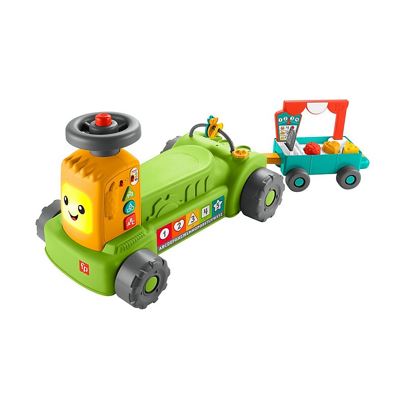 Your baby can ride, park, and roll into farm-fresh pretend play with the Laugh & Learn 4-in-1 Farm to Market Tractor ride-on learning toy from Fisher-Price. This interactive toy tractor with pull-along market wagon has fun lights, music, and 4 ways to play as your little farmer grows from infant to toddler. Switch up the learning as your baby grows with 3 Smart Stages levels that teach the alphabet, counting, shapes and more. Requires 3 AA batteries (not included). Ride-on toy tractor and market playset with 4 ways to play as they grow from baby to toddler: Riding, Sit-At Play, Pull-Along and Pretend Play. Press the 3 shape buttons or turn the steering wheel to see the tractors face light up with fun sounds and music. 3 Smart Stages levels grow along with your child with 75+ songs, sounds & phrases that teach the alphabet, numbers & counting, shapes, animal sounds, and colors. Fine motor play: squeaker horn, fruit and vegetable clacker rings, and gas cap clicker; plus 4 removable play pieces to sort into the market wagon. Helps develop balance, coordination and fine motor skills and fosters imaginative play for babies and toddlers ages 9 months to 3 years old.