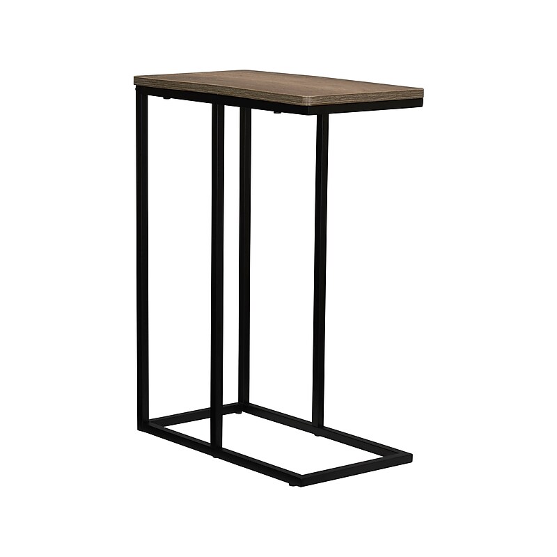 The simplistic style and versatility of this Household Essentials Jamestown modern side table make it a perfect workspace or additional surface area for your living room, lounge area, or office space. Thelaminate finish top complements the table's black frame, making an attractive addition to your furniture set. The C-shaped design gives this side table a versatile functionality: use this table as a traditional table next to any chair; angle it over the arm of the couch or your lap for a closer tabletop surface. This will bring the table's surface closer to you, adding an element of convenient accessibility. The four-leg support system adds extra stability while maintaining a minimalist style. This side table can be used in any seating area of the home. Use the table to enjoy dinner and a movie with family, work from home on your laptop, or finish homework from the comfort of your couch. The table can also be used as a corner table to showcase decorative accents, such as pictures, houseplants, and more. The compact nature of the C-shaped base design allows you to push the table's legs under the couch or chair, which, in addition to bringing the table closer, frees up more walking space. This feature is wonderful for smaller homes. Keep everything within reach by using this end table as a couch table for remotes, a TV tray table for snacks, a bedside nightstand, a laptop table, or a breakfast desk. Dimensions: 25"H x 10. 25"W x 18. 13"D. Features durable steel legs and frame in black, paired with a quality engineered wood top finished in a scratch-resistantwoodgrain laminate. Comes ready to assemble and is easy to put together (some tools are provided). Convenient C-shaped design of the base allows you to easily slide the table under a sofa or bed and extend the top over the armrest of a sofa or top of a mattress for a better accessibility. Rustic, slightly distressed,finish with its subtle gray undertones can push the style into farmhouse or even western styles, depending on what accessories you pair the table with. Four-leg support system adds extra stability while maintaining a minimalist style. Lightweight design makes this table easy to move when needed.