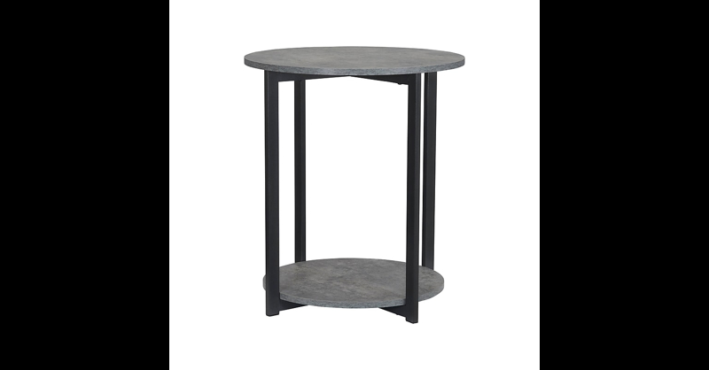 The Household Essentials Graystone round two-tier end table is a taller side table that is perfect for anyone looking to add a touch of modern inspiration to their home. The open sides framed by black four metal legs keep the table light and airy, while the rustic slate laminate finish tabletop creates the appearance of a concrete finish. The two-tiered small table is perfect beside a couch or sofa, stuffed chair, or bed. Simple and elegant, this table with a minimalist design looks great and helps your home function better. This round table can be used as an end table or side table in your living room, a bedside nightstand in the bedroom, or anywhere in your home you need a small table. Dimensions: 24"H x 21"Dia. Features durable steel legs and frame in black, paired with a quality engineered wood top finished in a scratch-resistantlaminate. Offers a lower storage shelf to help keep your belongings organized. Comes ready to assemble and is easy to put together (some tools are provided). Slate concrete finish lends the table a raw, industrial-modern aesthetic, with the rustic texture appealing to a more masculine style. Lightweight design makes this table easy to move when needed.
