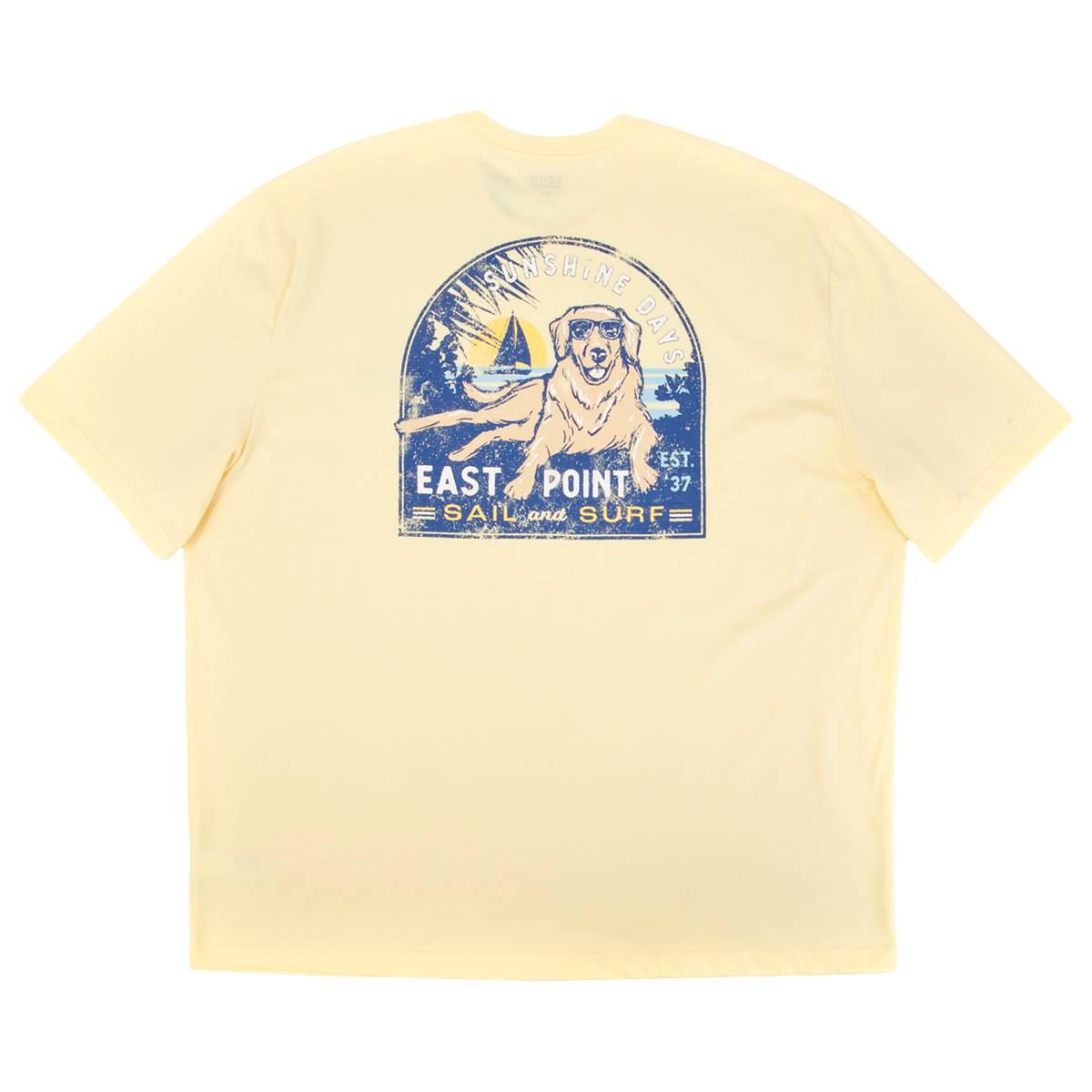 Pattern: Solid Sleeve Length: Short Sleeve Neck: Crew Ribbed Neckline "East Point, Sail & Surf" text on the front and back Dog wearing sunglasses graphic on the front and back "Sunshine Days, EST 37" text on the back Sailboat graphic with tropical accent graphics on the back.