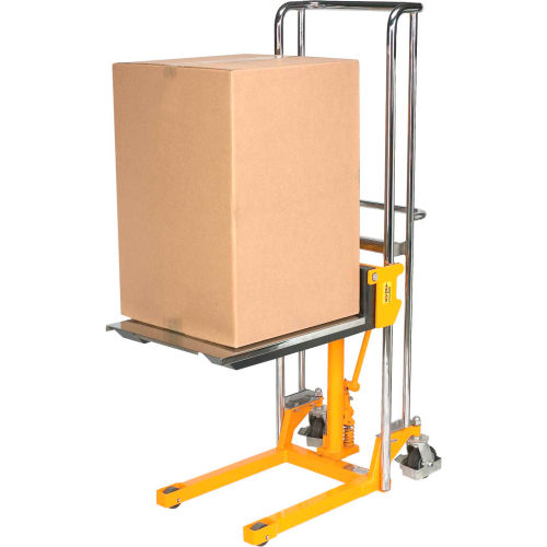 Wesco VALUE LIFT STACKER Perfect for lifting and positioning cumbersome office files, computer equipment and mail room supplies, these lift trucks are easily maneuvered in confined spaces. Durable steel construction, with chrome-plated rails and handles, ensures years of service. Stacker features adjustable 25-"L x 4-"W forks for added flexibility. Rolls easily with floor-protective 5" polyurethane swivel casters with brakes and 3" polyurethane load wheels. Foot Pedal Operated Stacker features a manual foot operated hydraulic pump that provides an economical means of lifting goods throughout your facility.