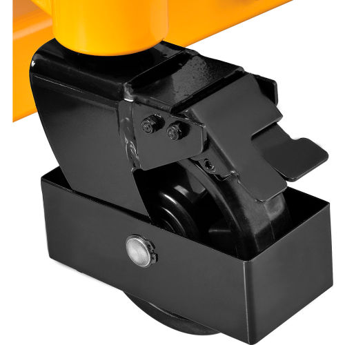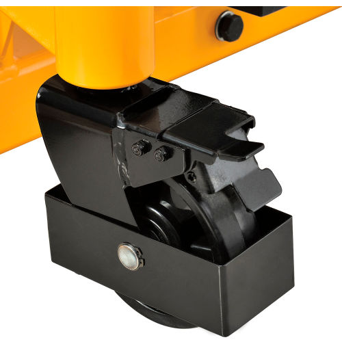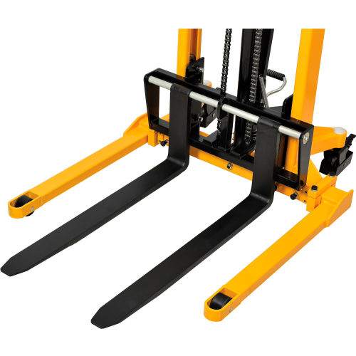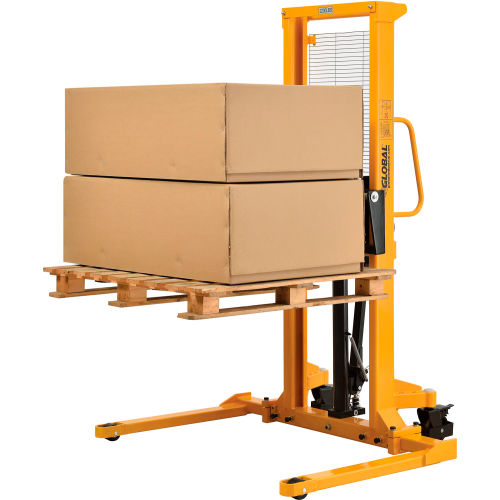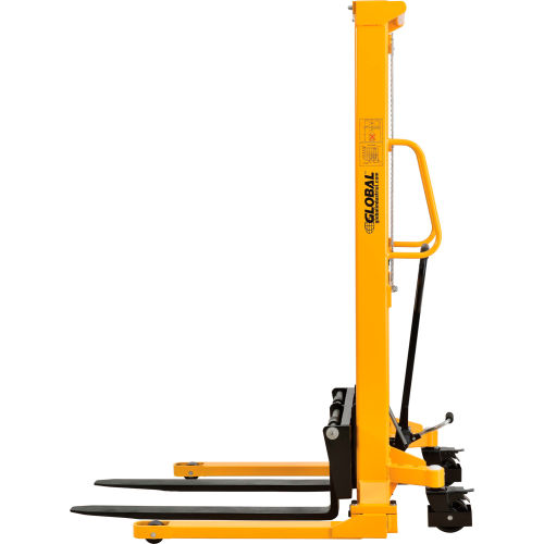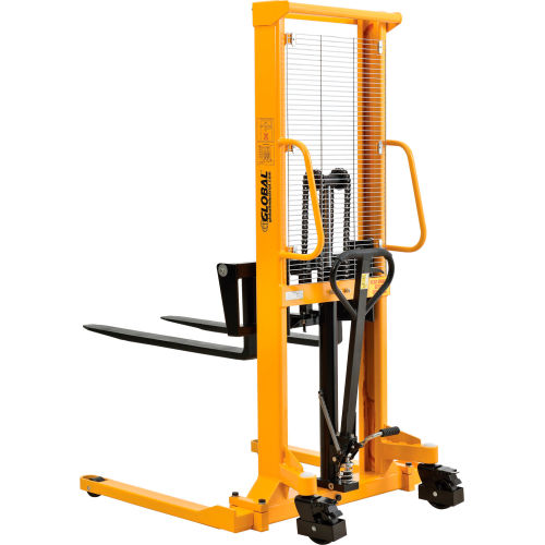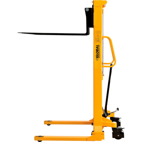 ✓ Supports up to 2,200 lbs. ✓ Easily lifts, transports, and stacks pallets ✓ Welded-steel construction for long-lasting durability The Global Industrial Hand & Foot Pump Operated Lift Truck is your solution for pallet handling applications. Featuring a durable steel chassis and mast, this manual stacker lifts, transports, and stacks palletized goods of up to 2,200 lbs. with ease. It offers both hand and foot hydraulic lift pump operation, where the hand-operated pump is identical to what is used on pallet jacks, for easy lifting and steering throughout your facility. Ideal for industrial or commercial use, this warehouse management essential rolls smoothly on (2) 6" phenolic swivel casters and (2) 3-3/4" phenolic load wheels. Limited 2-Year Warranty. Foot operated floor lock for stationary positioning Adjustable tapered forks (1/2" thick in the front to 1-1/16" thick in the rear) Includes a heavy-duty lifting chain, industrial-rated mast rollers, and a wire-mesh mast safety guard.