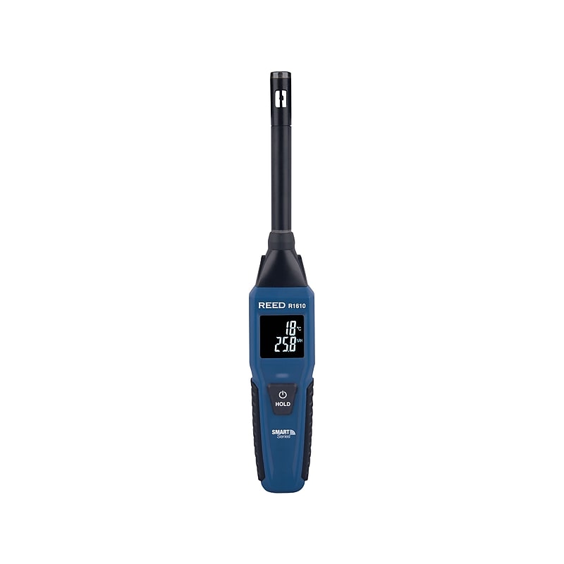 This compact thermo-hygrometer by Reed Instruments can be used either stand-alone or with the Reed Smart Series app (available for download on Android and iOS). When connected to the app, the thermo-hygrometer can be set up to log measurements over a given period. Real-time data-logging thermo-hygrometer measures ambient temperature and humidity. Kit includes: thermo-hygrometer, four AAA batteries. Dimensions: 9. 4"H x 1. 5"W x 1"D. Weight: 3. 2 oz. Can be used either stand-alone or with the Reed Smart Series app (available for download on Android and iOS). Provides wireless Bluetooth 5. 0 connectivity with a range of up to 246'. Easy to operate, designed for one-hand operation. Bendable probe shaft (3. 7"L x 0. 43"Dia. ) enables easy access to ducts. Integrated 1. 3" EBTN LCD display provides flexibility for use without a mobile device. Magnetic backing allows the instrument to be mounted to metallic surfaces. Tripod mount makes possible long-term monitoring. Features a low battery indicator and auto shutoff. Batteries provide a life of up to 50 hours. Temperature measuring range: -4 to 140-degrees Fahrenheit. Humidity measuring range: 0-100% RH. Maximum operating altitude: 6561'. Connect, measure, and log data from up to six instruments simultaneously. Meets or exceeds the CE, UKCA, FCC, and IC ID standards. 1-year manufacturer limited warranty. Safety Data Sheet.