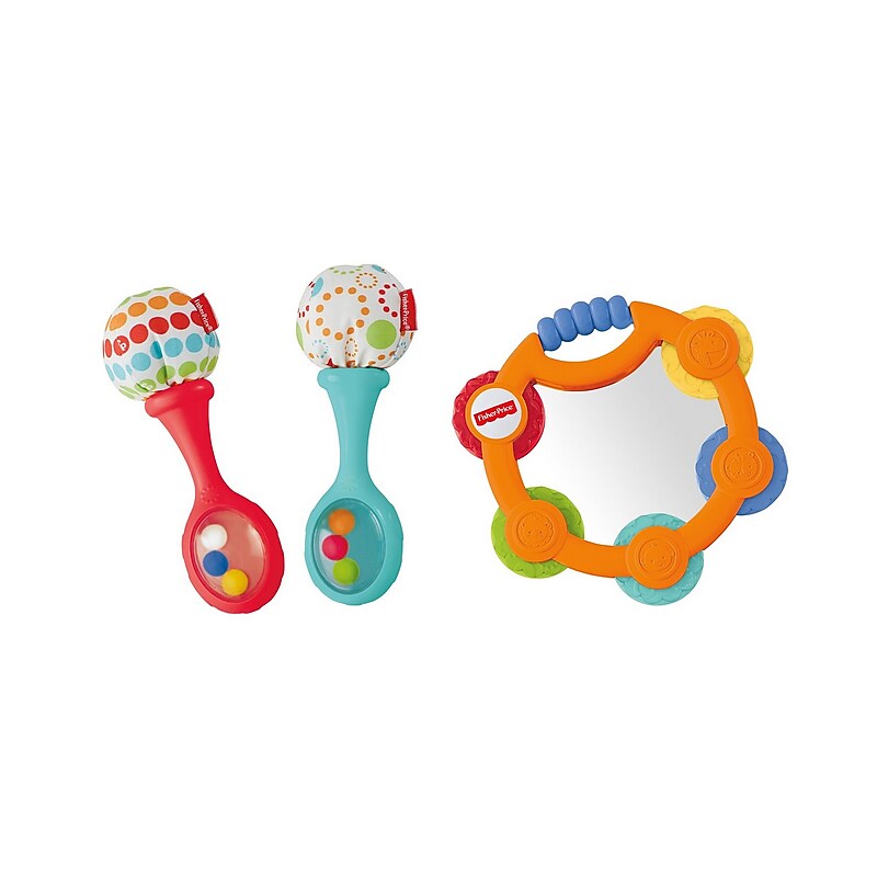 Shake, it baby! (Thats what this gift set encourages your teeny-tiny one to do. ) The Rattle n Rock Maracas are just the right size for little hands to grasp and shake, with soft pom-poms and colorful rattle beads in the handles to get baby rockin to the beat. The Shake n Beats Tambourine features bright colors, click-clack sounds and a large-shiny mirror to help stimulate little ones senses as they rock out! What a fun way to help foster an early love of music and babys developing skills, too!. Shake n Beats Tambourine with colorful clackers, mirror and grab, jam & go handle sized just right for little hands. 2 Rattle n Rock Maracas feature colorful rattle beads, soft pom-poms and easy-grasp handles. Grasping and shaking these toys help exercise developing motor skills. Bright colors and fun sounds help boost babys senses of sight & hearing.