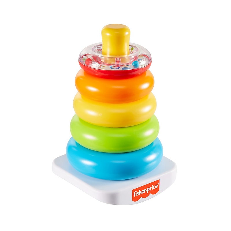 The Fisher-Price Rock-a-Stack toy offers classic stacking fun for your baby. Younger babies will love grasping, holding, shaking and exploring the five colorful rings. The littlest ring has a shiny, reflective surface for baby to discover insidewith colorful, swirling beads that make fun rattle sounds! When they're ready to sit and play, babies can stack the rings on the post, then bat at the wobbly base to make it rock back and forth. Stacking helps them develop hand-eye coordination and introduces them to the concept of relative size as they learn to sort and stack from biggest to smallest!. Classic stacking toy with 5 colorful rings to grasp, shake, and stack. Top ring has shiny surface with rattle beads inside. Roly-poly rocker base for wibbly-wobbly, bat-at play. Helps develop fine motor skills and gross motor skills as baby grasps, shakes, and stacks the rings. Great gift for babies and toddlers ages 6 months and older.