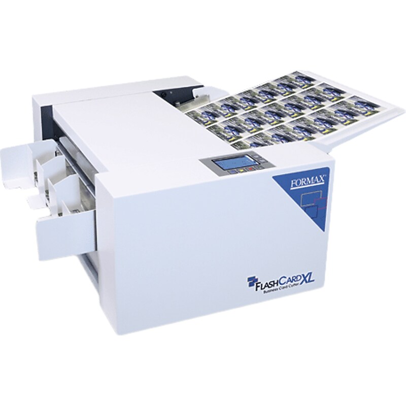 The Formax FlashCard XL business card cutter is a large-format, high-quality solution for short-run production of full-bleed business cards postcards, photos, and more. Its rugged and intuitive design allows users to cut cards on demand at up to 230 business cards per minute. Using an automatic friction-feed system, the FlashCard XL can cut coated and uncoated paper, laminated sheets, and cardstock. Its precision cutting blades are self-sharpening and accurate up to 0. 1mm. Users can also enhance accuracy by using the built-in registration mark reader. Business card cutter engineered for precision, bringing on-demand card cutting to the next level. Preprogrammed to process 12" x 18" and 13"x printed sheets; feed tray holds up to 40 200gsm sheets at a time and can accommodate paper weights up to 350gsm/130 lbs. Comes with a standard 3. 5" cutting cassette to produce 24-up 2" x 3. 5" business cards. Dimensions: 11. 5"H x 31. 5"W x 21. 5"D. Rugged and intuitive design allows users to cut cards on demand at up to 230 business cards per minute. Comes Featuring a user-friendly LCD display, it's easy for operators to choose one of six preprogrammed jobs or enter and save up to 10 custom cuts. Using an automatic friction-feed system, the card cutter has the ability to cut coated and uncoated paper, laminated sheets, and cardstock. Precision cutting blades are self-sharpening and accurate up to 0. 1mm. Users can also enhance accuracy by using the built-in registration mark reader. Features an interlocking cover: the blade will stop if the cover is opened. Optional interchangeable cutting cassettes are available to produce various-size pieces including 5" x 7" cards, 3. 5" x 5" postcards, 4" x 5" photos, 8. 5" x 11" full-bleed brochures, 11" x 17" menus, gift tags, mailers, and more. Optional cabinet with waste bin is great for users with increased volume and features casters for easy movement and storage. Power: 110V, 50/60Hz, 0. 6A. 90-day manufacturer limited warranty.