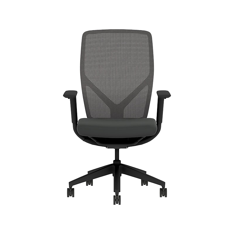 Your workplace and the way you get it all done has evolved. Chances are, you're not stationed in one place all day anymore, and when you've got a schedule packed with meetings and project planning, the last thing you need is a task chair with confusing adjustments and fussy mechanisms. Designed to support you through a variety of postures and tasks, HON Flexion goes with the flow when you're on the go. With a dynamic seat design that relieves pressure points, a single, uncomplicated lever for easy adjustments, and a clean, frameless aesthetic, this smart seating solution understands that to keep productivity at its peak, comfort is nonnegotiable. Perfect for unassigned seating spaces like benching, touchdown and hybrid areas, Flexion offers straightforward performance and easy agility to energetic environments. Task chair perfect for unassigned seating spaces, such as benching, touchdown, and hybrid areas.four-way stretch mesh back, Contourett black fabric seat, black frame. Maximize your back and shoulder support with the back frame designed with torsion in mind to move and flex with you. Overall dimensions: 42. 5"H x 27. 88"W x 25"D. Seat dimensions: 15"-19. 6"H x 19. 13"W x 17. 38"D. Back dimensions: 24"H x 18. 75"W. Height-adjustable arms for added comfort. Rated for up to 300 lbs. Full assembly required. Four-point seat suspension responds and adapts to your movements, no adjustments necessary. Get comfortable with weight-activated flex functionality that responds and adapts to you as you sit. Find the right fit with one-touch seat height adjustment. Hard floor casters for added mobility. Lifetime limited warranty; 12-year warranty on four-way stretch mesh and seating controls. Model Option: HFXT1. F0. STC. A. H. IM. UR10. NL. SB. T.