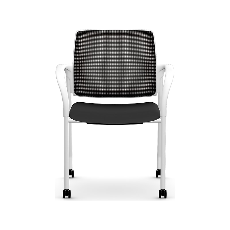 Multipurpose areas require a multifaceted seating solution. The HON Ignition multipurpose stacking chair is the perfect answer for a variety of uses, and even better when the room isn't being used at all. The contoured back can make even the longest meeting more pleasurable, and the foam seat cushioning delivers all-day comfort for an all-day training session. When you need to clear valuable floor space, the lightweight four-leg frame stacks four high. The casters move as fast as you can, making rearranging a whole room a task for one. Out of the way when you want it, right in your comfort zone when you need it. Multipurpose guest chair gives lobbies and other public areas a professional look.mesh back, soft foam seat upholstered in Centurion black fabric, and durable steel frame in a textured designer white finish. Contoured seat and back reduce pressure points to deliver ergonomic support. Overall dimensions: 33. 5"H x 25"W x 21. 75"D. Seat dimensions: 18. 38"H x 18. 75"W x 17. 38"D. Back dimensions: 18. 13"H x 18. 25"W. Fixed arms provide upper body support; arm width: 21. 5". Supports users up to 300 lbs. Assembly required. Meets or exceeds BIFMA e3 Sustainability, ANSI/BIFMA, ISTA, and SCS Indoor Advantage standards. Stackable four high on the floor to save valuable space. Wall-saver leg design prevents damage to walls or cabinets. Hard casters roll quietly and effortlessly on all floor types. Lifetime limited warranty; 12-year warranty on four-way stretch mesh. Model Option: HIGS6. F. H. IM. CU10. PK7.