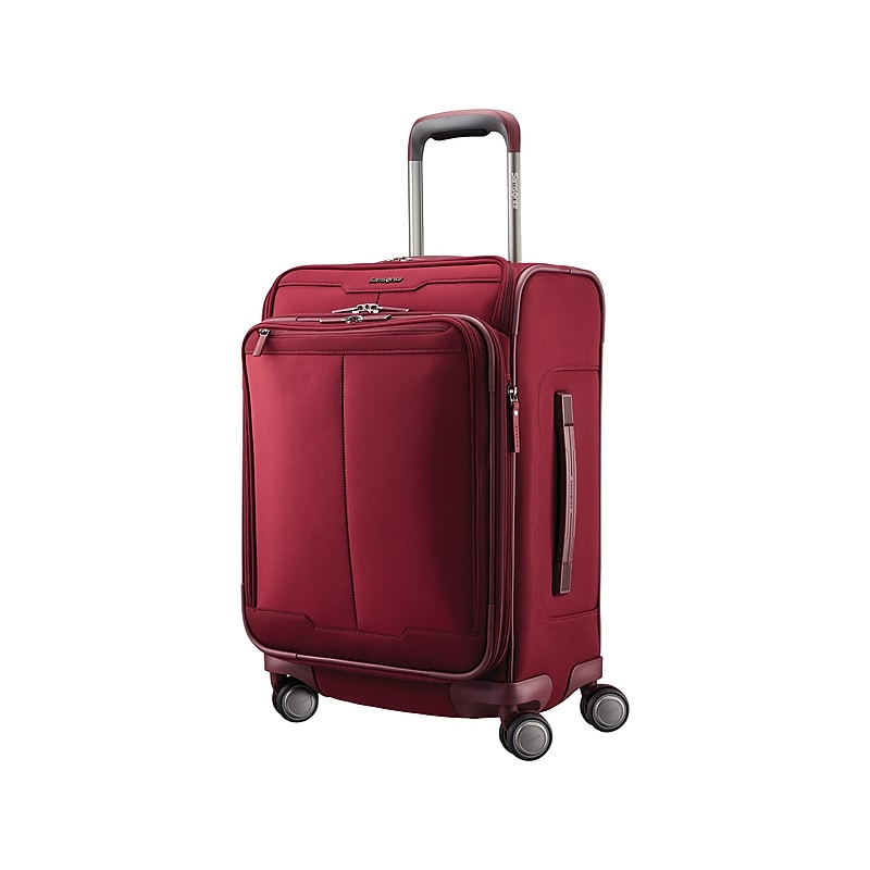 The Samsonite Silhouette collection launched in 1958 as the most advanced luggage ever made. 60 years of modernization leads us to Silhouette 17, an update to Samsonite's longest-lasting collection for global executives. This is your power carry-on. Plug in your wireless charger and slip in your phone to the TecKit easily accessible through the smart top pocket. Inside, locate everything with an organized interior fully featured with a FlexPack system, and enjoy the glide with the Tru-Trac GT REV wheels. Features a durable polyester soft-side exterior red color. RightHeight handle system offers multiple 1" incremental height adjustments for a highly customized fit, with a padded grip for extra comfort. Overall dimensions: 23"H x 15. 5"W x 10. 5"D; internal dimensions: 21"H x 14. 8"W x 8. 3"D. Removable FlexPack system: a packing cube that also works as a compression panel, offering uniform compression and modular organization. Exterior and interior lining are made of fabric created using 100% postconsumer recycled PET bottles. SmartFix buckles keep your tie-down straps out of the way when packing, then fasten securely over your belongings. Quick-change compartment provides quick and easy access to travel essentials. Features a removable 3-1-1 WetPak, perfect during security checks. Fuzion zippers by YKK on the exterior provide five times more abrasion resistance and repairability. Custom-engineered dual spinner wheels provide enhanced shock absorption and effortless maneuverability. Smart top pocket provides an easy access with bonus organization. Includes a designated TecKit pouch for your tech, so you never travel unprepared. Comes with a retractable ID tag for discreet identification. Features multipoint grab handles for easy carrying. Expansion: 1" extra packing capacity included. Weight: 8. 2 lbs. Carry-on size and weight allowances vary by airlines: if the bag is overstuffed, it may not be accepted by the airlines. 10-year manufacturer limited warranty. ⚠ WARNING: California Proposition 65 Warning. This product can expose you to chemicals including lead, which are known to the State of California to cause cancer and birth defects or other reproductive harm. For more information go to www. P65Warnings. ca. gov.