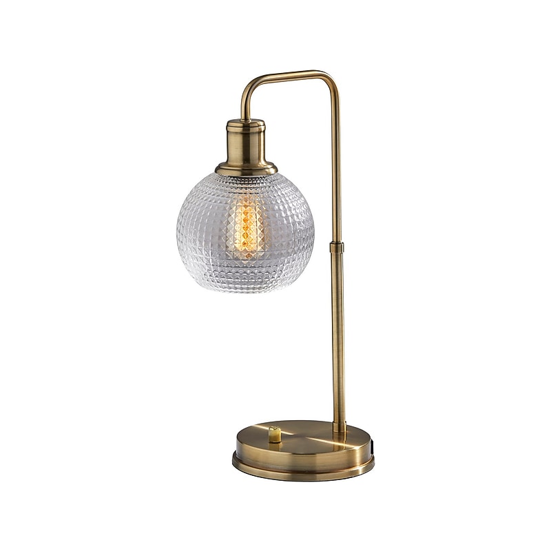 A perfect fit for any area of your home to add some warm ambient light, this Simplee Adesso Barnett subtle statement piece has you covered. A mid-century modernfinish adds contrast to the globe-shaped clear textured glass shade. The bulb is not included, so that the user can select their look. A clear LED bulb is perfect for a workspace, while a trendy vintage Edison bulb is a great fit for a moody bedroom. Charge up your smart device at any time with the USB port built right into the base. A simple rotary switch on the base turns the lamp on and off. Perfect fit for any area of your home to add some warm ambient light, this table lamp has you covered. Requires a 40W bulb with E26 medium base (not included). Overall dimensions: 20. 5"H x 7. 5"W x 10. 5"D. Antique brass finish adds contrast to the globe-shaped clear textured glass shade. Comes with a 5. 42' clear cord. Simple rotary switch on the base turns the lamp on and off. Charge your smart devices at any time with the USB port built right into the base. Shade dimensions: 5. 75"H x 7"Dia. ; base dimensions: 7. 5"Dia. Meets or exceeds the ETL standard.