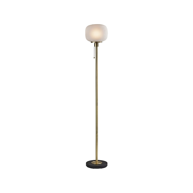 Add a classy touch of mid-century design to your space with the Adesso Hazel floor lamp. A frosted ribbed glass shade emits a beautiful ambient glow when lit. Turn the lamp on and off with a convenient pull-chain switch. Anfinish and a black base add to the clean, modern design. This lamp is ETL listed, meaning it has been tested and approved to meet the government-regulated safety standards for the USA. Add a classy touch of mid-century design to your space with this elegant floor lamp. Designed for a 60W incandescent bulb with E26 medium base (bulb not included). Overall dimensions: 65"H x 10"Dia. ; base size: 10"Dia. ; shade size: 8"H x 10"Dia. Antique brass finish and black base add to the clean, modern design. Round frosted ribbed glass shade emits a beautiful ambient glow when lit. Comes with a 5' black cord. Operated by a convenient pull-chain switch. Meets or exceeds the ETL standard.
