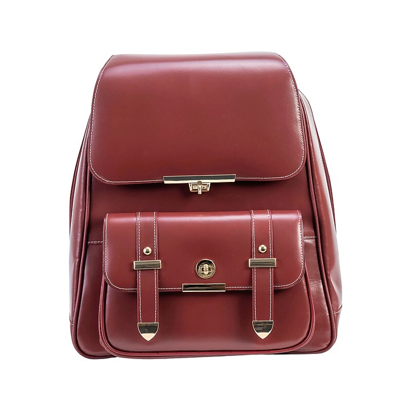 The McKlein MARYVILLE business laptop/tablet backpack features two front pockets (a zippered one and one with flap-and-belt design and clasp turn closure) and one main zippered compartment with flap and turn clasp closure. The main compartment has a wide opening, unzipping all the way down on each side, and includes a laptop/tablet pocket, a zippered pocket, and four slip pockets for power cords, plugs, and accessories. Zippers to the main compartment can be locked. Other features include a fully lined interior, gold-tone hardware, adjustable straps, a back zipper pocket, a handle hook for carrying or hanging, and protective metal feet on the base. Laptop backpack makes travel with electronics simple. Made of top-grain cowhide leather Designed to fit a range of laptops with screens up to 11". Backpack size: small. Features one main compartment that includes a tablet pocket (10"H x 7"W), a padded laptop pocket (11"H x 9. 5"W x 1"D), and four slip pockets for power cords, plugs, and accessories; plus two front and one back pockets. Lifetime manufacturer limited warranty. ⚠ WARNING: California Proposition 65 Warning. This product can expose you to chemicals including lead, which are known to the State of California to cause cancer and birth defects or other reproductive harm. For more information go to www. P65Warnings. ca. gov.