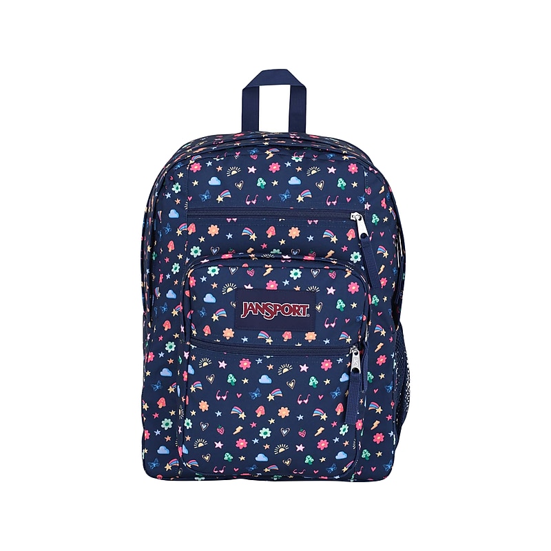 The big news with JanSport Big Student is that it now features a dedicated 15" padded laptop compartment. You still get two large main compartments, a front utility pocket with organizer, a pleated front stash pocket, a side water bottle pocket, ergonomic S-curve shoulder straps, a fully padded back panel, and a zippered front stash pocket that keeps all your gear organized. Go Big or go home. Laptop backpack made of 100% recycled 600D polyester with a fun pattern on a dark blue background. Comes in medium size and features two large main compartments for optimal organization space, and a dedicated 15" padded laptop compartment with zip closure. Dimensions: 17"H x 13"W x 7. 5"D. Front utility pocket with full organization panel and key clip. Two exterior zippered stash pockets for quick access. Single mesh bottle pocket stretches to fit large bottles. Fully padded back panel for long wear comfort. Ergonomic S-curve shoulder straps and a webbing grab handle on the top. Capacity: 2100 cu. in. (34L). Lifetime manufacturer limited warranty.