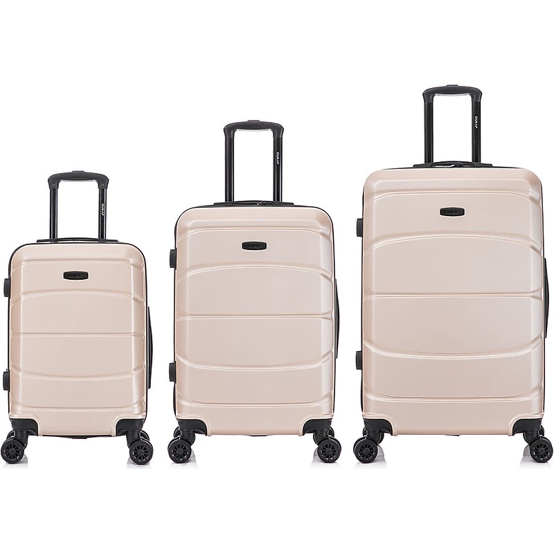 Elevate your travel experience with the complete DUKAP SENSE lightweight hardside spinner luggage set, crafted for discerning travelers. Each piece, from the carry-on to the checked bags, is equipped with 360-degree spinner wheels for seamless navigation, ensuring you travel with grace and ease. This set boasts a carry-on and two checked bags for long trips or family travel. Experience a seamless blend of elegance, durability, and functionality with the SENSE luggage set, where every piece is meticulously crafted to elevate your travel experience. Interior Measurements: (Large)28"= 18. 5"W x 11. 41"D x 28"H, (Medium)24"= 16. 14"W x 10. 23"D x 24"H, (Small)20"= 13. 77"W x 8. 66"D x 20"H. Exterior Measurements: 28"= 19. 29"W x 11. 41"D x 29. 33"H 24"= 16. 92"W x 10. 23"D x 25. 39"H 20"= 14. 56"W x 8. 66"D x 21. 45"H. Made of lightweight PC/ABS material with a micro diamond textured finish; comes color. Equipped with top and side ergonomic gel handles for comfortable and easy lifting. Offers full interior fabric lining with a zippered compartment on one side and snap-on elastic cross straps on the other for easy packing. Hard-flex construction offers maximum strength, durability, and a water-/scratch-resistant finish. Features a push-button locking internal retractable trolley system. Four side studs allow the luggage to stand upright on its side. Smooth-gliding oversize zippers provide easy maintenance. Four dual-spinner 360-degree silent wheels for effortless mobility. Weight: 8. 59 lbs. (large); 6. 83 lbs. (medium); 5. 73 lbs. (carry-on). Capacity: 24. 46 gal. (large), 16. 32 gal. (medium), 9. 76 gal. (carry-on). 10-year manufacturer limited warranty. ⚠ WARNING: California Proposition 65 Warning. This product can expose you to chemicals including lead, which are known to the State of California to cause cancer and birth defects or other reproductive harm. For more information go to www. P65Warnings. ca. gov Safety Data Sheet.
